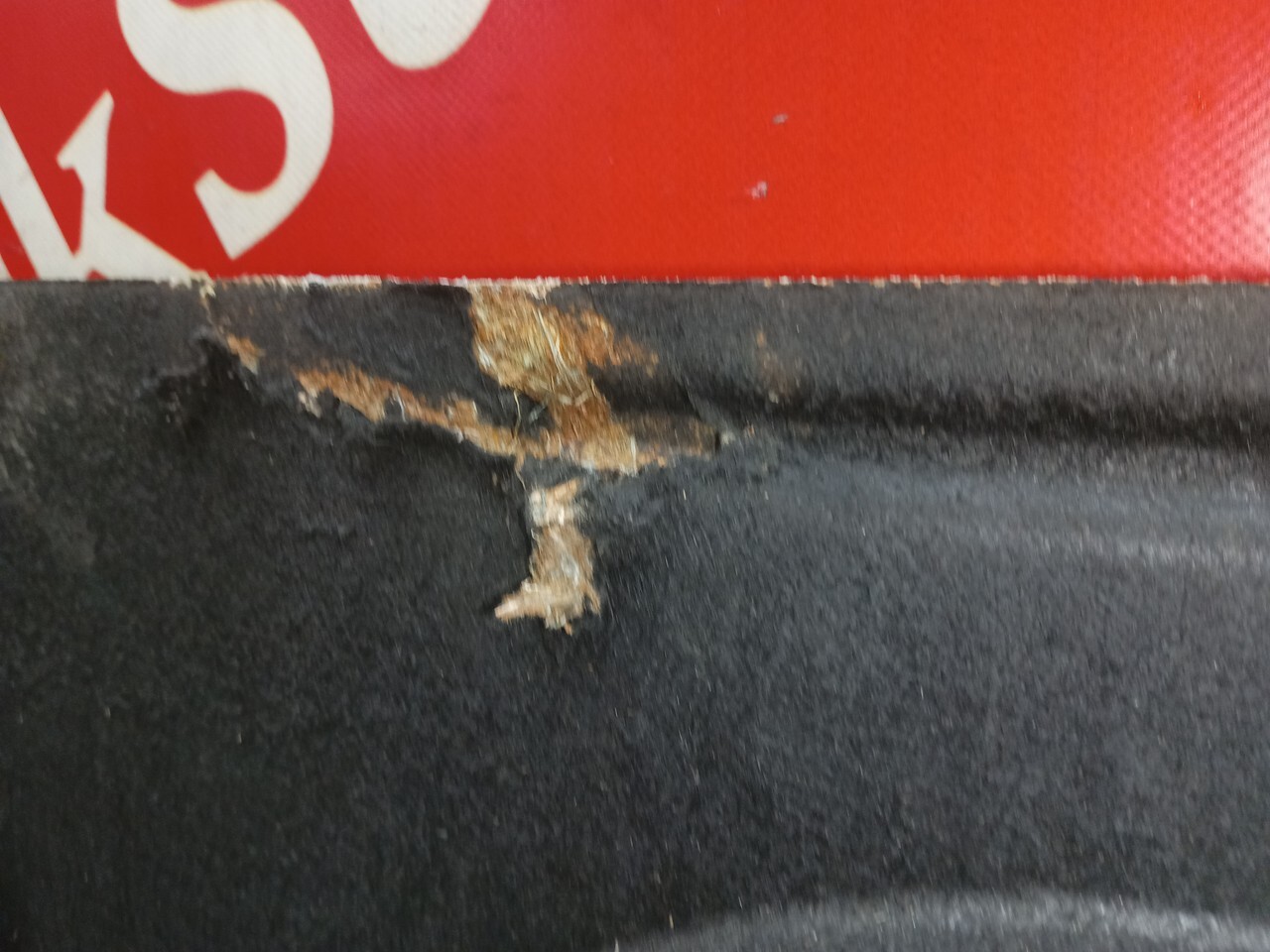Дефект: скол крепления, надорван материал, отображено на фото.